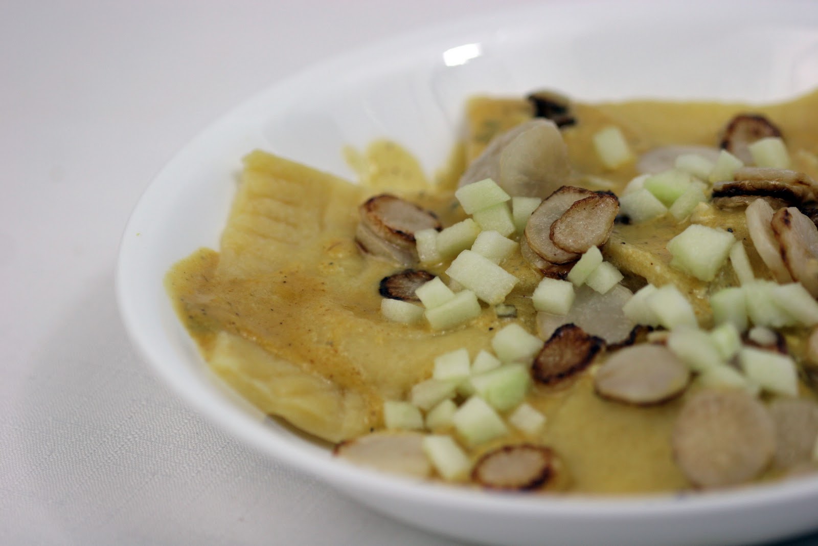 Pumpkin ravioli with a pumpkin butter, white wine and cream cheese sauce, topped with sauteed icicle radishes and chopped Granny smith apple